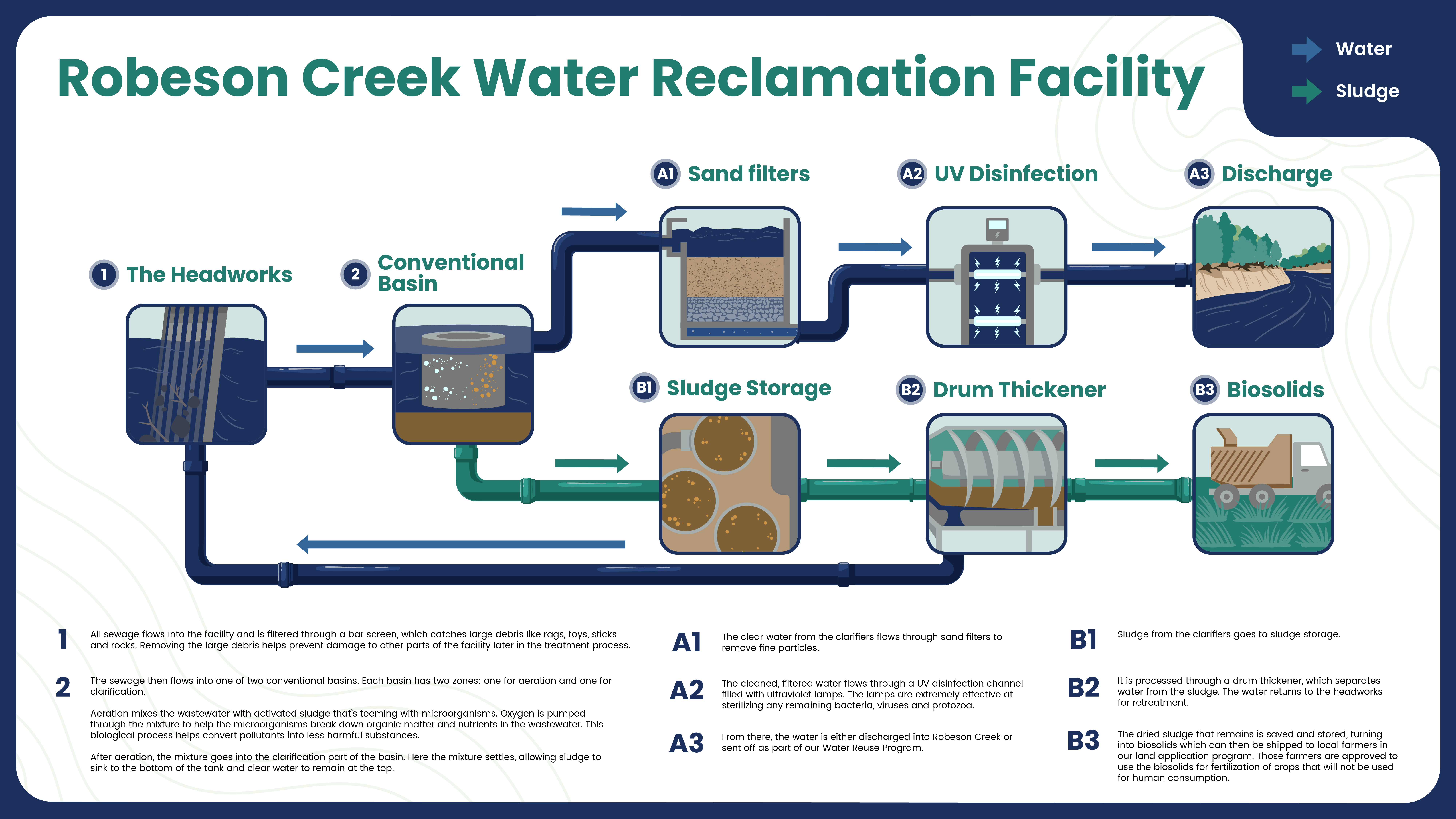The facility uses two conventional basins to treat raw sewage and discharge clean water back into Robeson Creek. The facility is certified to treat up to 750,000 gallons of wastewater per day.